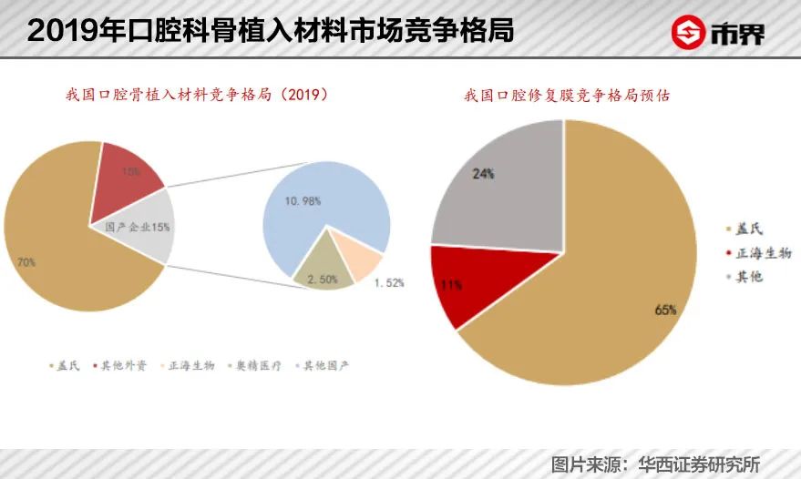 虽然这个行业“暴利”,但在口腔修复赛道,正海生物的优势并不大,当前仅盖氏一家就占据我国口腔科骨植入材料行业约70%的市场份额,国产产品仅占约15%的市场份额。