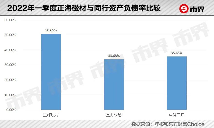 就在秘波海积极推动旗下公司上市时,作为“正海系”最大的现金奶牛——正海磁材的资产负债率已经达到了历史高点,截至2022年一季度末高达50.65%,而同行金力永磁和中科三环同期资产负债率分别仅为33.68%和35.65%。