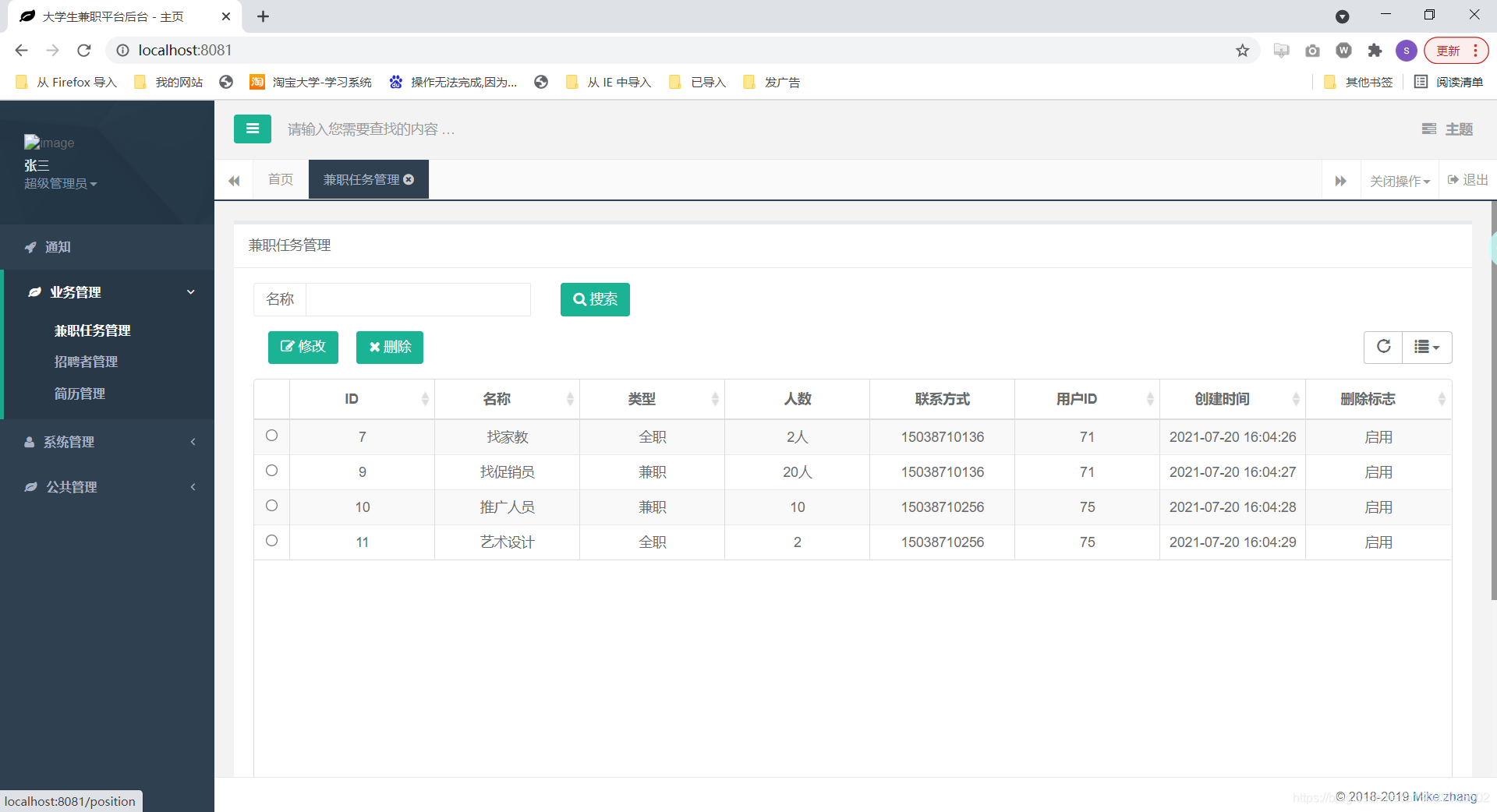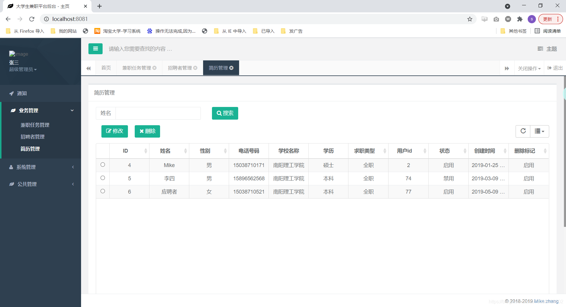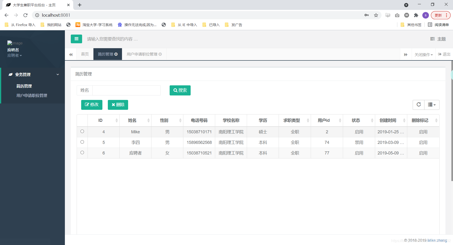 详情页(名称,求职方向(派单。。),求职类型(兼职,全职),求职区域,性别,学校,专业,自我评价,查看联系方式,按照时间最新排序求职发送经历)