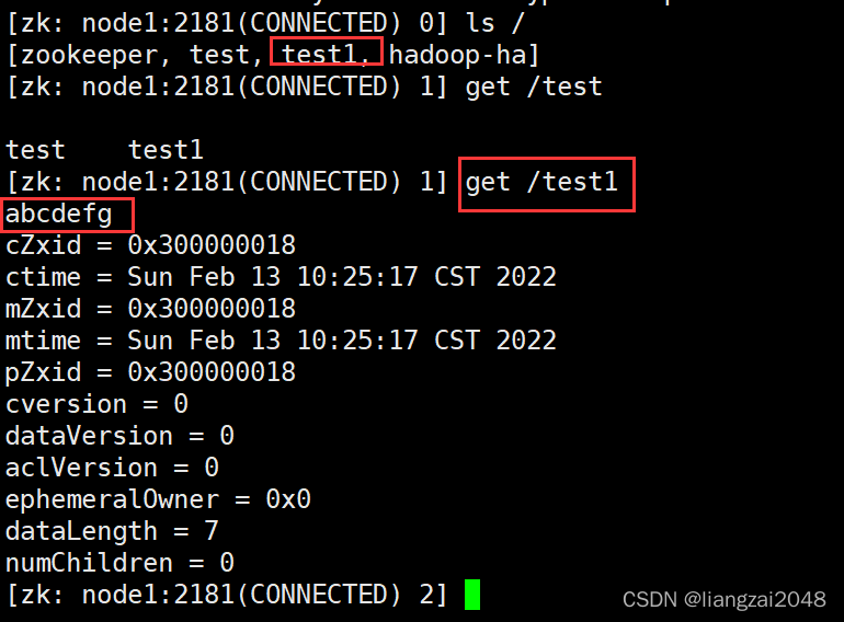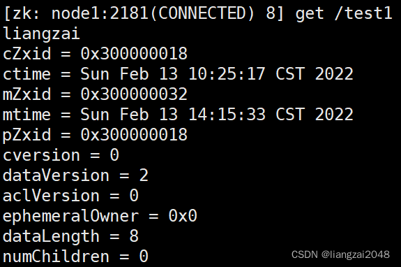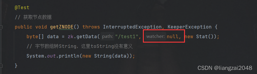 );}@Test// 获取节点数据publicvoidgetZNODE()throwsInterruptedException,KeeperException{byte[] data = zk.getData("/test1",null,newStat());// 字节数组转String,这里toString没有意义System.out.println(newString(data));}@Test// 修改数据publicvoidsetZNODE()throwsInterruptedException,KeeperException{