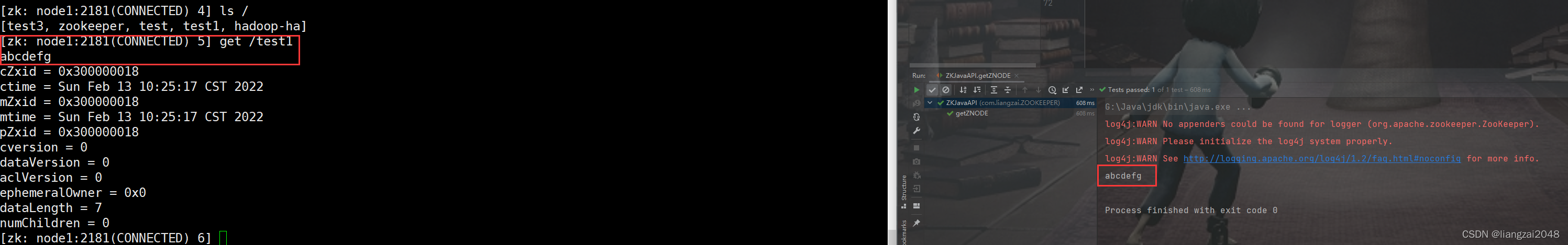 zk =newZooKeeper("master:2181,node1:2181,node2:2181",100000,null);}@Test// 获取节点数据publicvoidgetZNODE()throwsInterruptedException,KeeperException{byte[] data = zk.getData("/test1",null,newStat());// 字节数组转String,这里toString没有意义System.out.println(newString(data));}@After// 关闭连接publicvoidclosed()throwsInterruptedException{