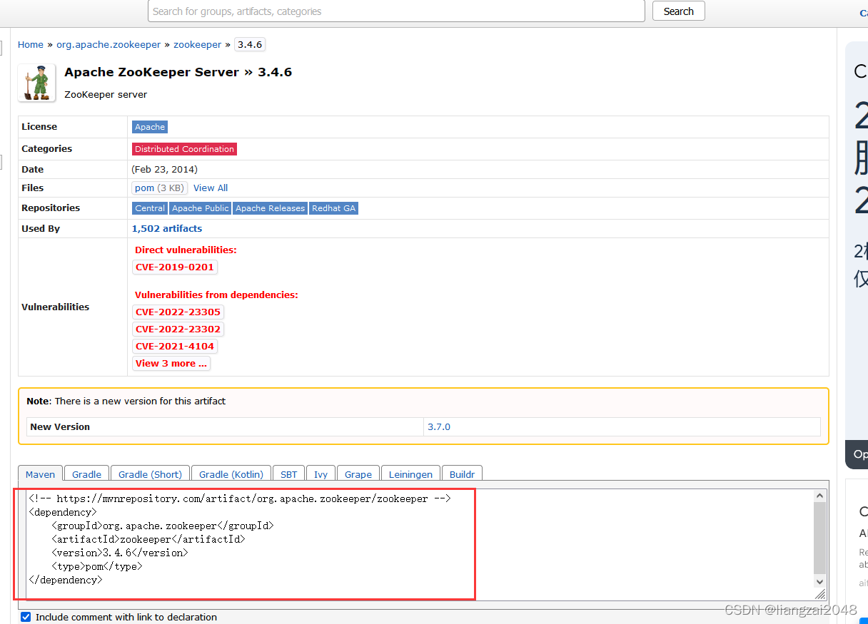 <!-- https://mvnrepository.com/artifact/org.apache.zookeeper/zookeeper --><dependency><groupId>org.apache.zookeeper</groupId><artifactId>zookeeper</artifactId><version>3.4.6</version></dependency>