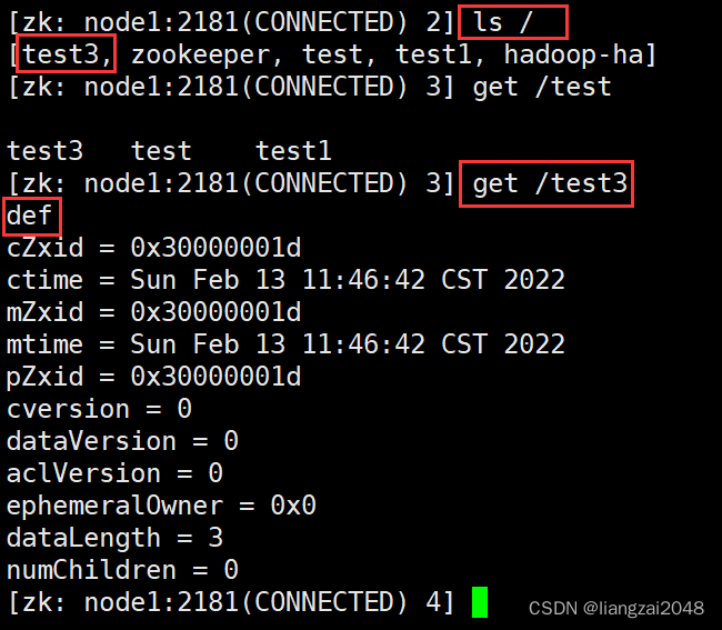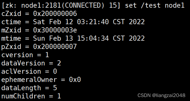 zk.setData("/test1","liangzai".getBytes(),1);}@Test// 删除节点publicvoiddeleteZNODE()throwsInterruptedException,KeeperException{