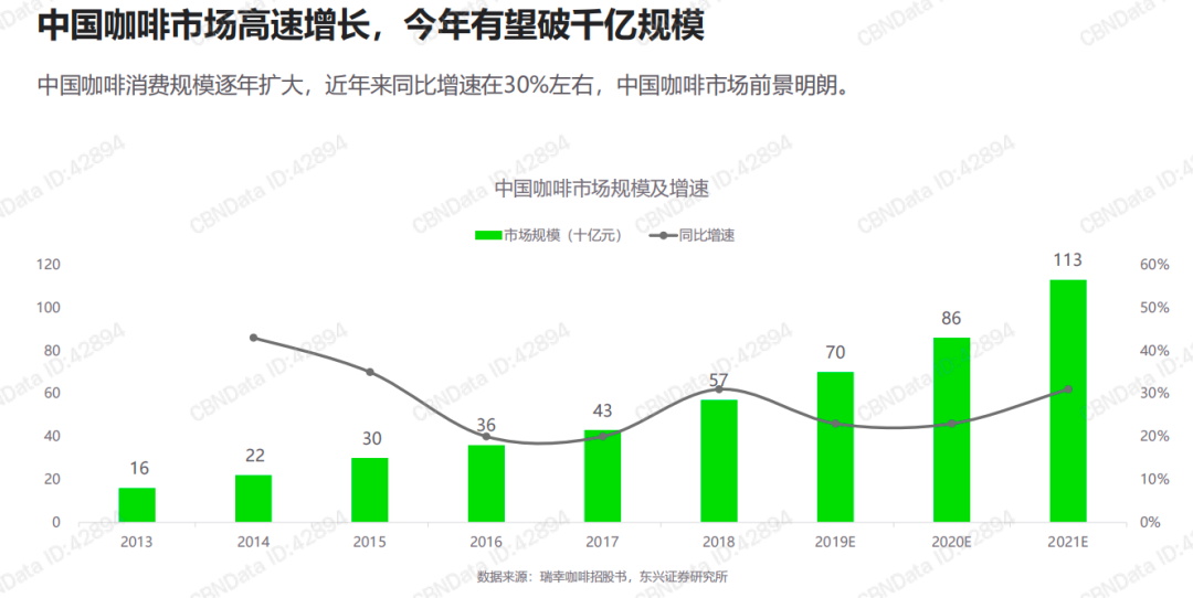 资本终于等来了中国咖啡经济的井喷期。据艾媒咨询研究报告,2021年中国咖啡行业市场规模为3817亿元,预计2025年达一万亿元,复合增长率大于20%。自雀巢速溶咖啡1989年进入中国,咖啡店代表星巴克1999年于中国开设第一家店,至今三十余年的咖啡市场教育,中国消费者从体验阶段逐渐步入咖啡刚需阶段,近六成中国消费者每周消费咖啡,两成每天消费咖啡。《2021年青年咖啡生活消费趋势洞察》数据显示,中国咖啡市场消费规模正稳步上升,近年同比增速在30%左右。**