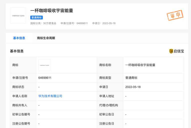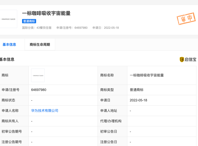 “一杯咖啡吸收宇宙能量”和“一标咖啡吸收宇宙能量”,这个略长略显“中二”的名字,就是华为近日为旗下咖啡业务低调申请的餐饮住宿类商标。目前该商标已提交申请,处于等待实质审查阶段。