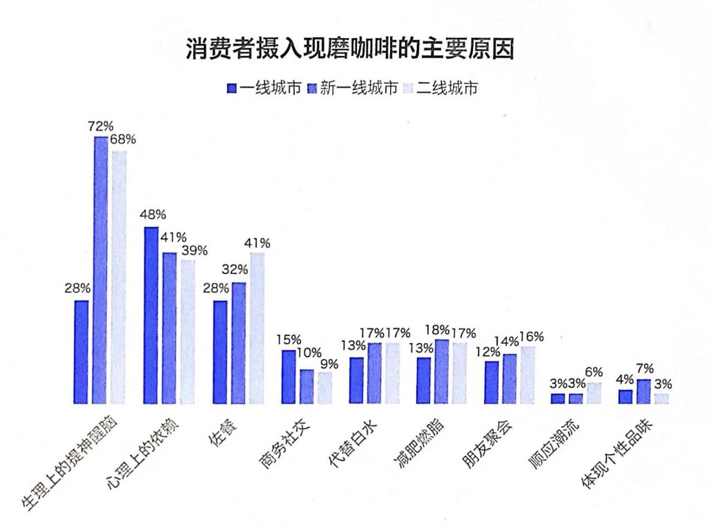 在2022年发布的《中国咖啡行业深度全景解读》一文中,“商务社交”在消费现磨咖啡的理由中排名第4位,这一比例在一线、新一线和二线城市的占比分别是15%,10%和9%。