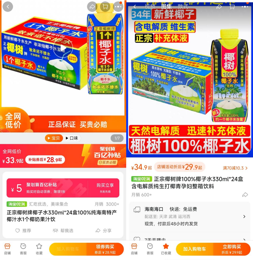 同时,在厚椰乳方面,天猫超市中,1升装的菲诺厚椰乳,券后价15.8元,月销量超过1万件;淘宝椰树牌椰汁超市中,同样1升装的椰树厚椰乳,售价18.9元,月销量仅为100多件。