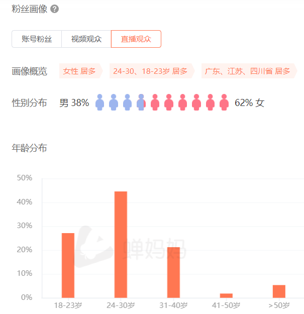 潘哥发现,蝉妈妈数据显示:作为椰树猛男直播主阵地,抖音“椰树集团海南椰汁饮料有限公司”账号,近两周的直播观众62%为女性,其中又以24岁至30岁女性为最多,占全部女性观众的44.5%。