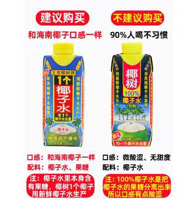 同样是椰树品牌,椰子水包装不同、口味不同,原因在于其配料。客服告诉潘哥:“产品‘1个椰子水’,用新鲜椰子水生产,本身就含有果糖;而产品‘100%椰子水’,则是有顾客爱喝无糖款,因此把椰子水中的果糖,给分离了出来。”