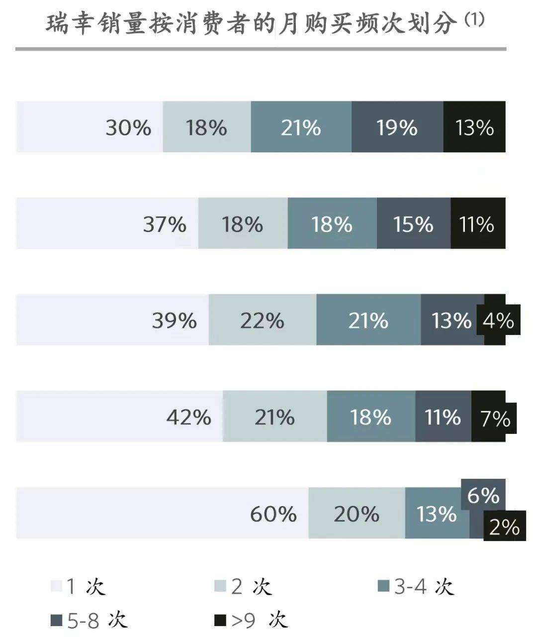 雪湖资本《瑞幸咖啡投资研究报告》显示,瑞幸用户的月购买频率为2.1杯,高于星巴克的1.9,蜜雪冰城的1.7,喜茶的1.4。瑞幸总销量中,每月购买5次以上的高频消费者贡献了32%的销量,对比星巴克是26%,蜜雪冰城是17%,喜茶是8%。