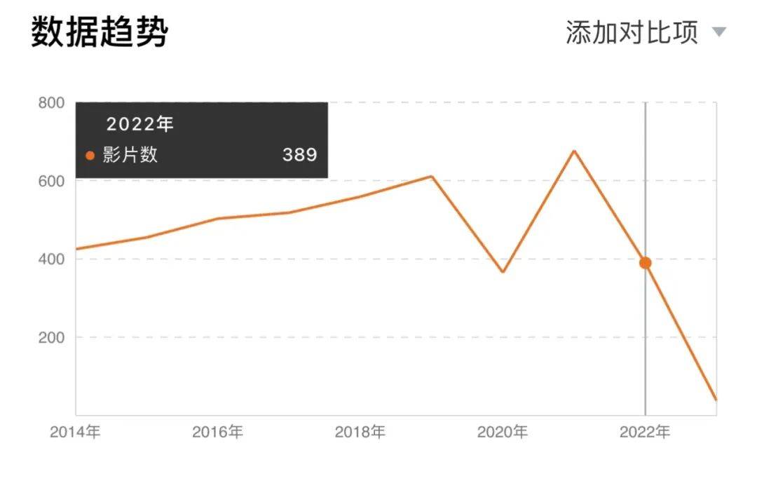 由于本土疫情原因,去年全国上映新片数量从2021年的677部骤降至389部,产能暴跌42%+。这缺失的影片中,有一部分是因为疫情原因被迫改档,也有不少有实力的项目选择主动暂缓上映。项目数量少了,便从根源上就降低了项目营销出圈的概率。