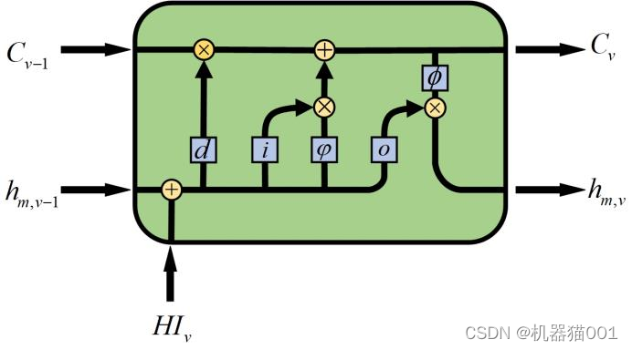 其中:蓝色框中 d 、 i 、 o 表示 LSTM 单元的遗忘门、输入门和输出门。