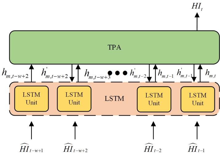 TPA-LSTM 模型是利用 TPA 机制对 LSTM 模型隐含层输出值进行运算,相比于 LSTM 模型,关注以往不同时刻的隐含层输出值与当前时刻隐含层输出值之间的关联,即通过计算两者相关性确定以往隐含层输出值的权值,获得最终隐含层输出值。本文所使用的 TPA-LSTM 模型结构如图3所示。图中网络的输入为前 w-1 个时刻(t-w+1~t-1)的时间序序列,网络输出为当前 t 时刻预测值。