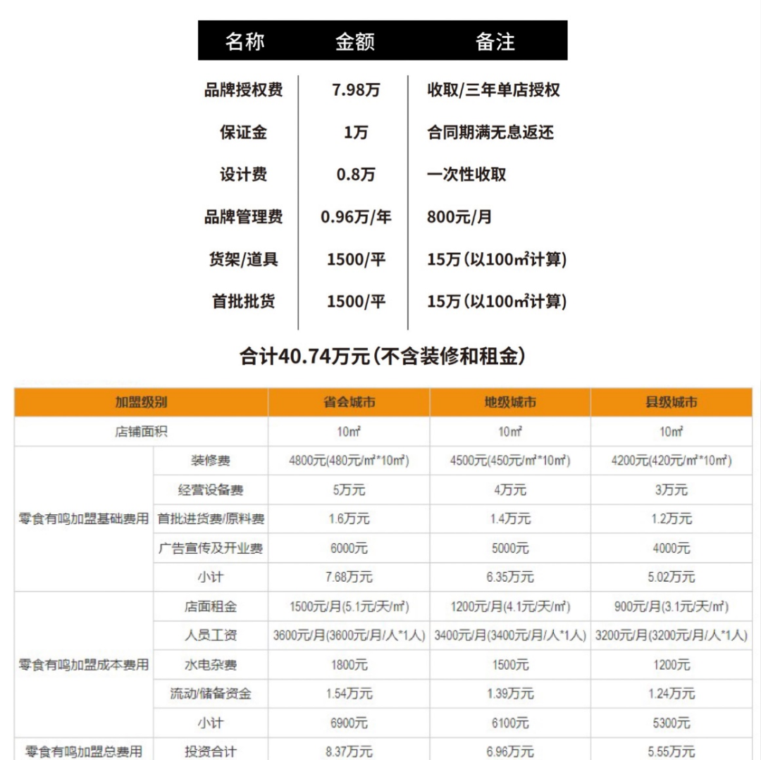 还有一类品牌的加盟方式则需要在前期投入更多。据锌刻度了解,“零食有鸣”一家10㎡的店铺,需要投入包括加盟费、保证金、装修费、经营设备费、首批进货费等在内的费用共计5.55万元至8.37万元之间;“好幸福”一家100㎡左右的门店需要投入包括品牌授权费、保证金、设计费、品牌管理费、货架/道具费、首批货款在内的费用共计40.74万元。