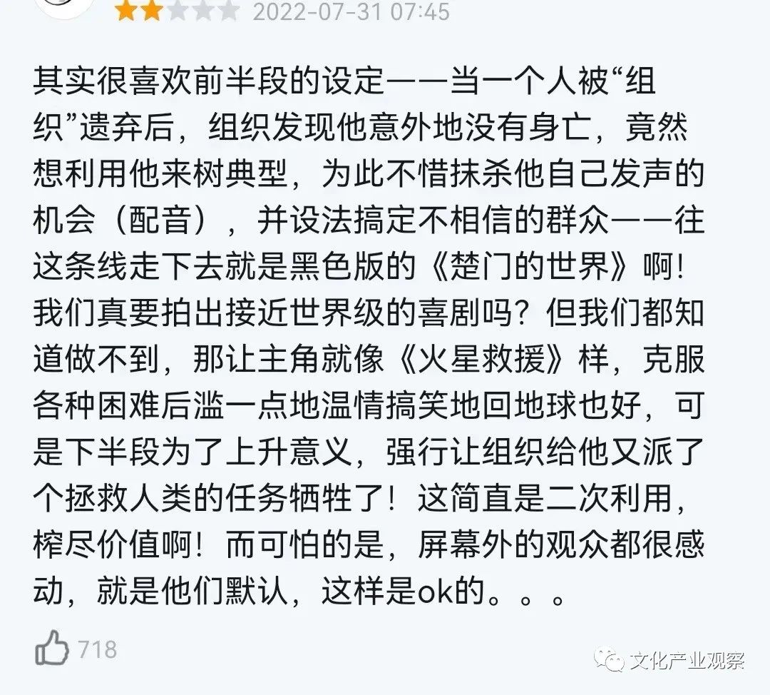这其中必然有外界因素存在,如热度逐渐消散、新上映电影的冲击、观众逐渐增多,可究其根本,仍是《独行月球》并不是一部纯粹的喜剧片,犯了“既要又要”的错误,最后落得一个观感不好、差评增多的现状。