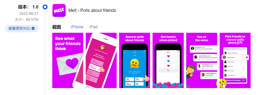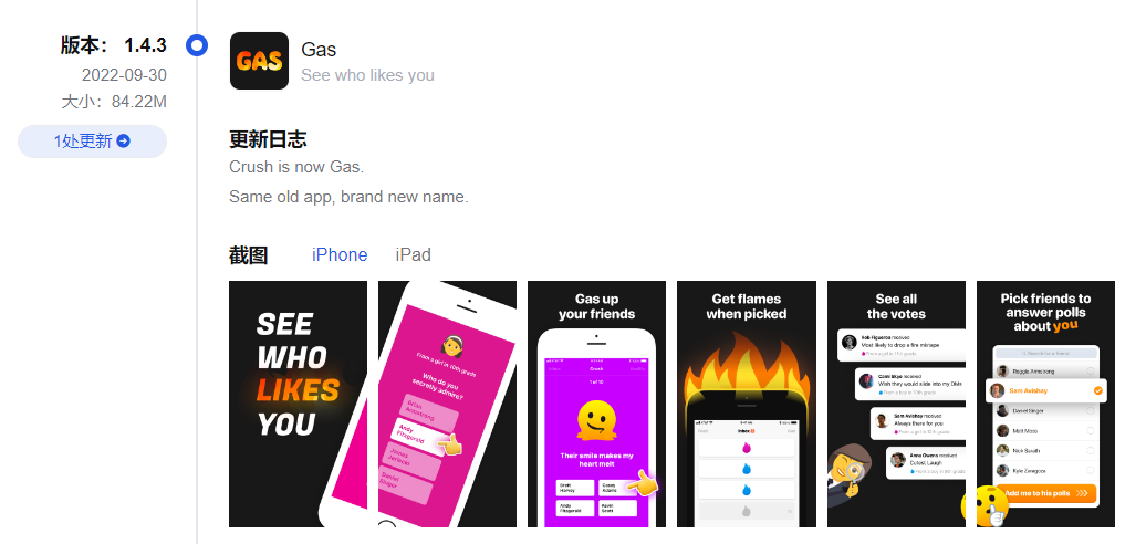 除了玩法相似,上下架时间相邻,Simp 和 Gas 在发行策略也有相互呼应之处,鉴于 Simp 的“风评被害”,目前 Gas 的开放地区均有意识地避开了此前 Simp 涉足的阿拉巴马州和佐治亚州。与此同时,似乎是为了避免用户在第一印象上将 Gas 和 Simp 联系起来****,在不到两个月的时间里,Gas 改了 3 次名字和 4 次 icon,名字从 Melt、Crush 到 Gas,icon 也从明亮的粉紫色到黑橘配色。9 月 30 日,“改造”完成后的 Gas 正式上线,并在 10 月陆续将开放地区由密歇根州扩展到宾夕法尼亚州、密苏里州、伊利诺伊州、威斯康星州、俄亥俄州和印第安纳州,终于在 10 月 12 日问顶美国免费榜,将匿名问答推上又一个高潮。