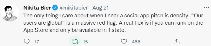Nikita Bier 曾在 Twitter 上分享过一个非常有趣的“用户密度”的理论。用户密度,是他评判一个社交 App 时唯一衡量的数据指标,他认为,**“我们的用户来自全球”是一个危险信号,与之相对,一款产品如果仅在 1 个州开放就能做到 iOS 下载榜单 Top1 会更显灵活(Flex)。**回顾 tbh,看过 Simp 下架到 Gas 上线的一整历程,也许会对 Nikita Bier 原文所言的“Flex”有更为深刻的认识。