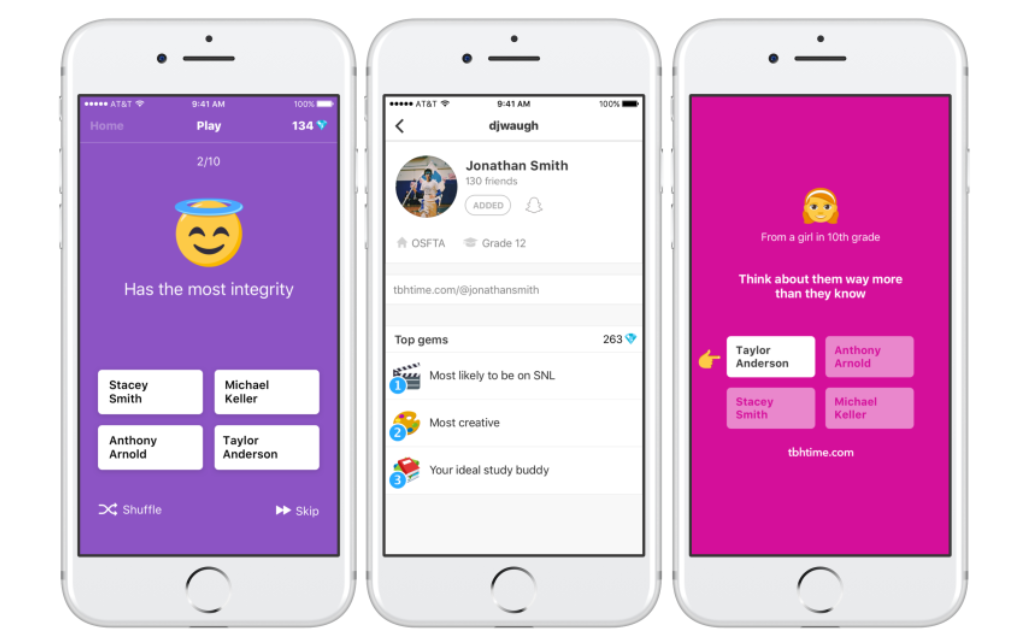 而第二个原因则在于青少年+匿名问答的玩法经历过市场验证,Nikita Bier 很有信心青少年们会喜欢 Gas 的玩法。Gas/Simp 更早的原型是一款于 2017 年上线、名为 thb 的匿名问答产品(同样是以高中生/青少年为主要目标群体)。透过当年的一些产品图片,能看出 tbh 和 Gas/Simp 相似度很高,并且当时 tbh 是在不到 3 个月的时间里就累积到了 250 万日活用户。