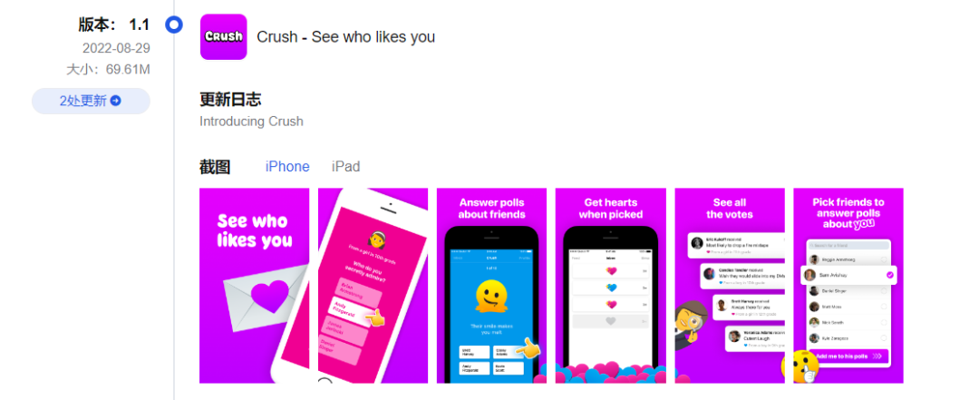 不知大家看到以上玩法介绍时的感受如何,笔者瞬间想到了大学时期风靡各个校园的“告白墙”,只不过 Gas 更私密,是 1 对 1 版本,虽然发行商账号叫做 Find Your Crush,但整体的问题更偏向“友情告白墙”。****在苹果商店的用户评论中,多出现的关键词是“有趣”、“夸赞”和“全校都在玩”。实际上,Gas 对自己的定位也大致如此——“一个赞美朋友的应用程序”。