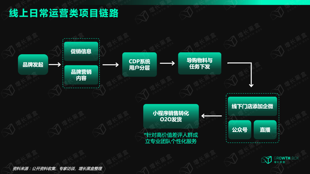 日常销售以品牌为单位,由品牌主导,使用第三方服务商(有赞、微盟、驿氪等)小程序作为载体,每个品牌都有自己的小程序商城。用户在线下进店后,会添加导购企业微信进入导购线上私域,由导购推送小程序链接。也有部分用户通过公众号、直播引流进入小程序,系统则会通过地理位置就近分配导购,以进行后续的用户培育。