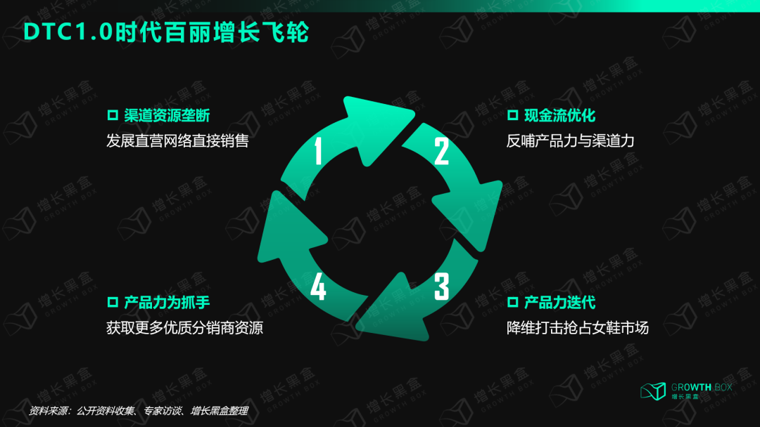 - 传统品牌早期通常会采用经销模式扩展渠道,但百丽很早就布局直营,能更加敏锐地对市场做出反应,渠道力和产品力共同构成早期百丽的增长飞轮,同时直营模式为后来的DTC转型打下基础。