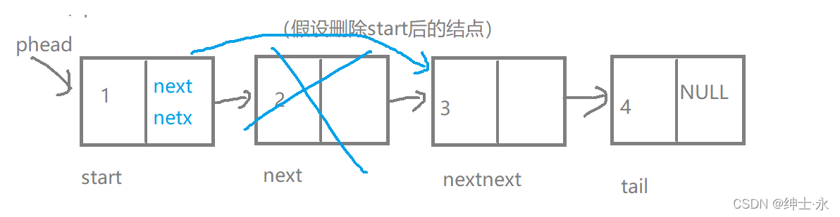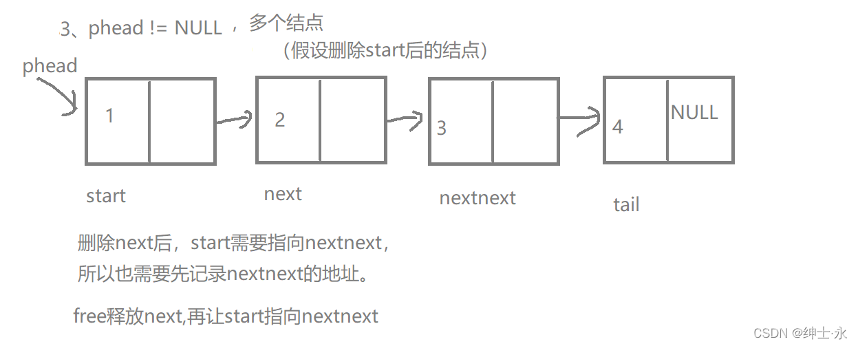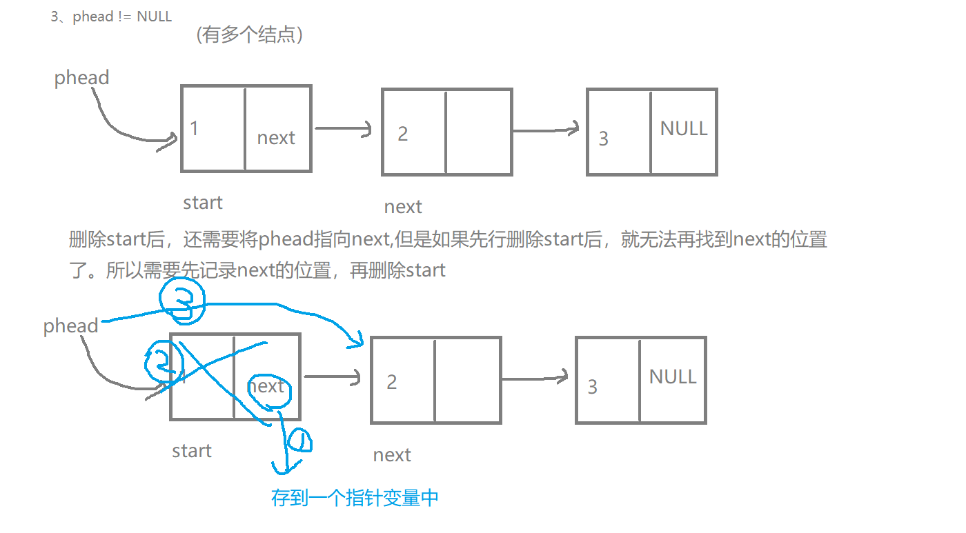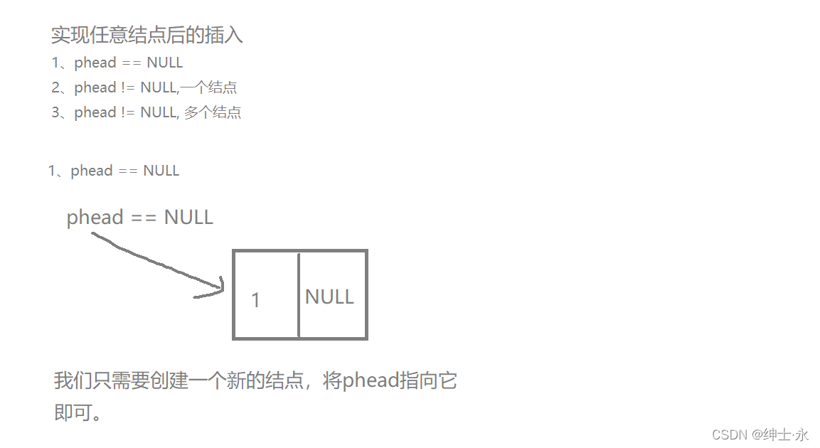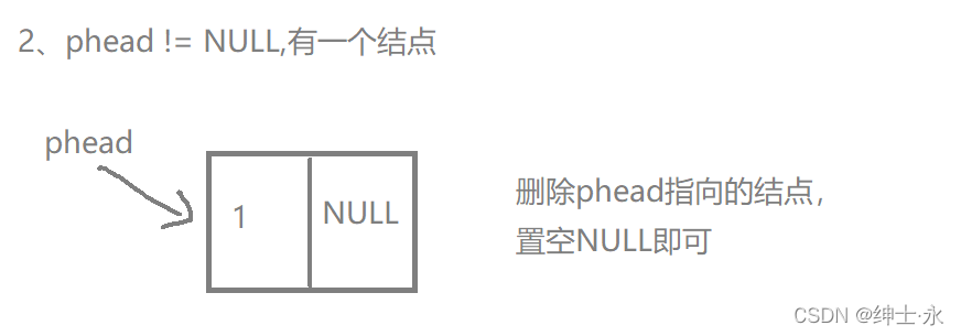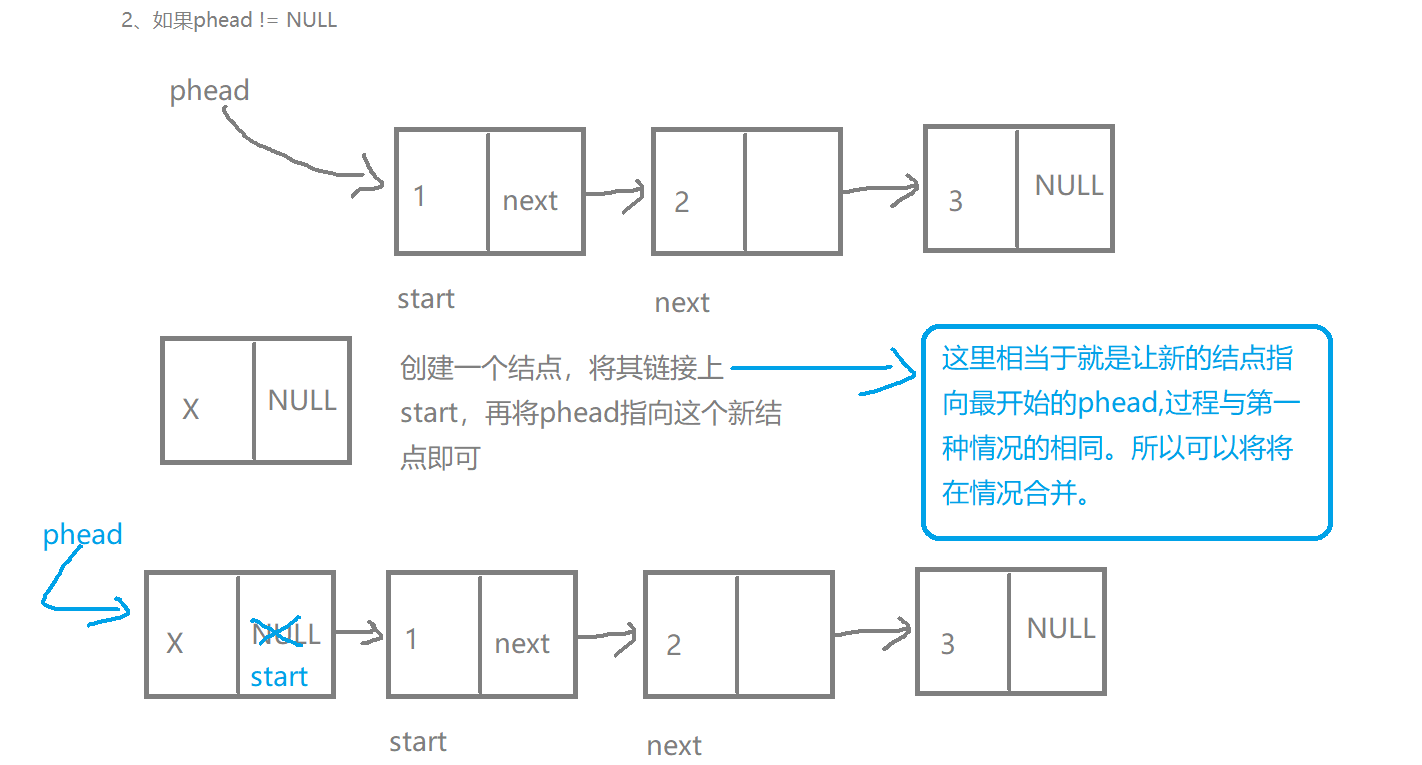 又图解分析,后面两种也可划分为一种代码实现逻辑:1、phead == NULL。2、phead != NULL,一个节点 + 多个结点的情况。