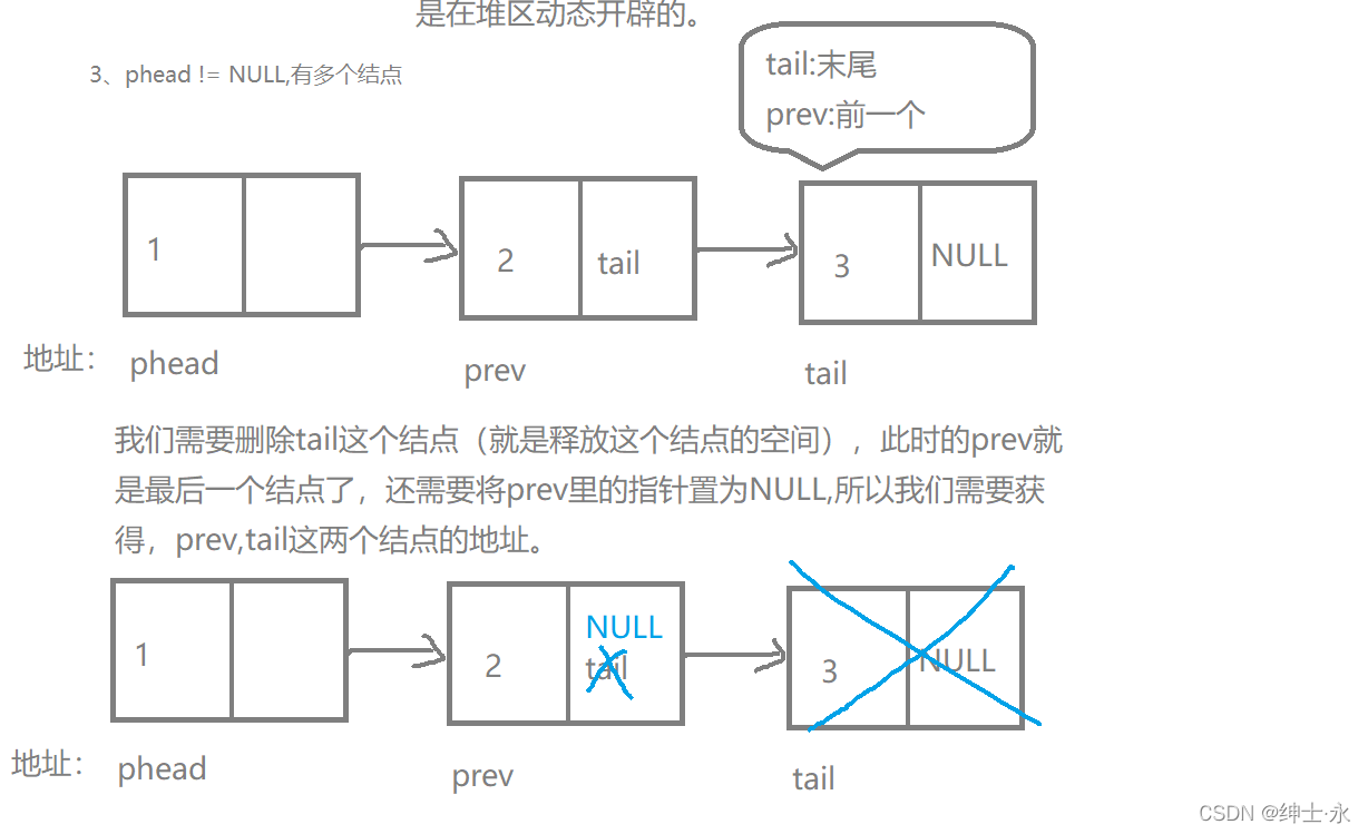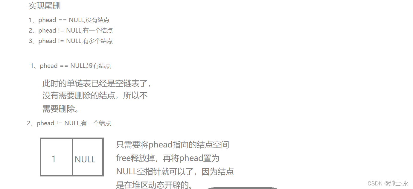 实现尾删分三种情况:1、phead头指针为空指针。2、phead头指针不为空指针,只有一个结点。3、phead不为空指针、有多个结点。