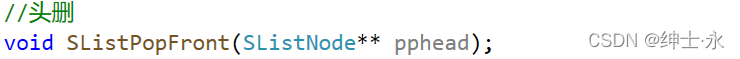 //头删 void SListPopFront(SListNode** pphead) { //1.phead == NULL //2.有一个结点 + 有多个结点 if (*pphead == NULL) { return; } else { SListNode* cur = *pphead; *pphead = (*pphead)->Next; free(cur); cur = NULL; } }