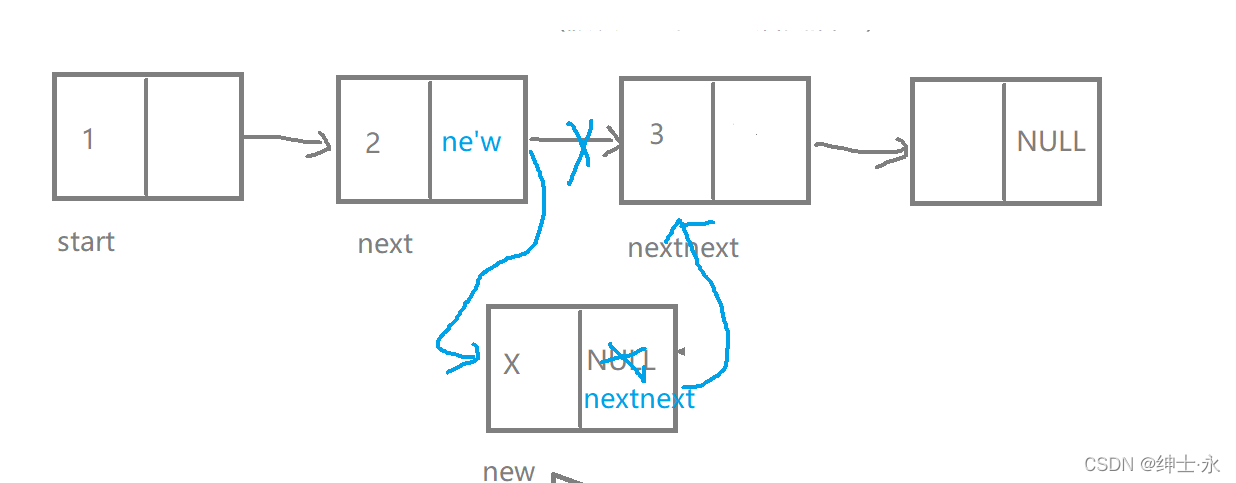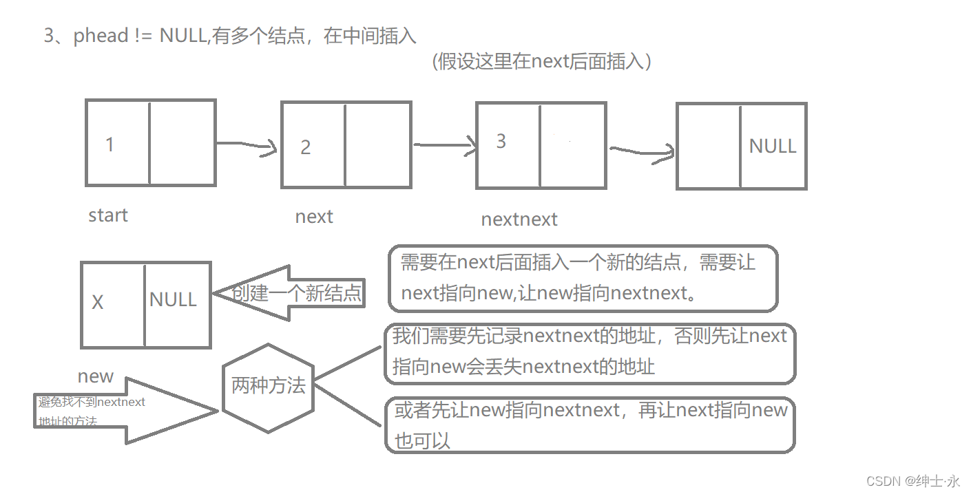 //任意插入 void SListInsertAfter(SListNode** pphead, SListDateType pos, SListDateType x) { SListNode* newnode = BuySListNode(x); if (*pphead == NULL) { *pphead = newnode; } else { SListNode* cur = *pphead; while (cur->date != pos) { cur = cur->Next; } newnode->Next = cur->Next;//这里使用第二种避免找不到地址的方法 cur->Next = newnode; } }