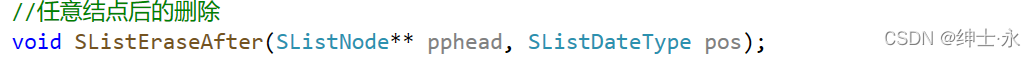 //任意结点后删除 void SListEraseAfter(SListNode** pphead, SListDateType pos) { if (*pphead == NULL) { return; } else if ((*pphead)->Next == NULL) { free(*pphead); *pphead = NULL; } else { SListNode* cur = *pphead; while (cur->date != pos) { cur->Next; } SListNode* next = cur->Next; SListNode* nextnext = next->Next; free(next); next = NULL; cur->Next = nextnext; } }