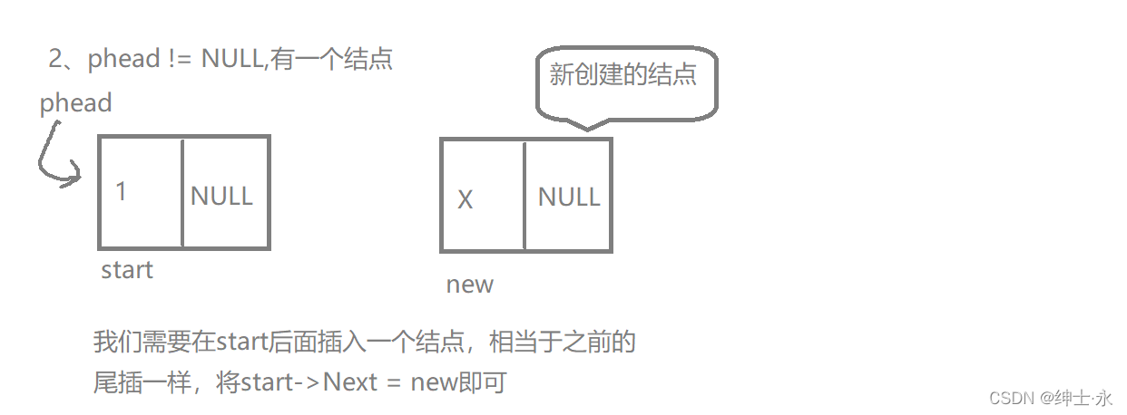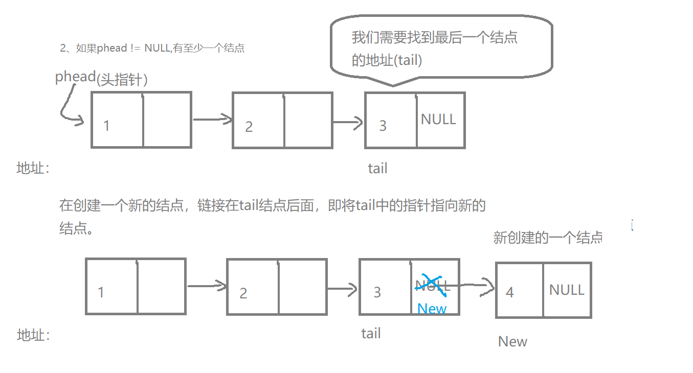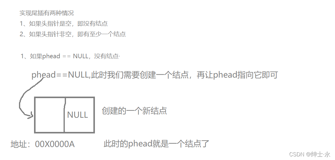 实现尾插有两种情况:1、phead头指针为NULL。2、phead头指针为非空。