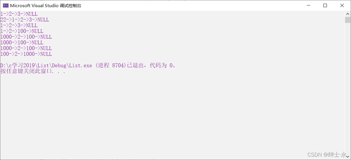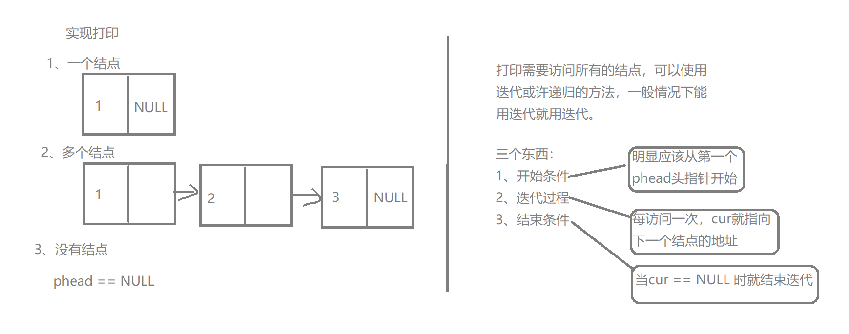 //打印 void SListPrint(SListNode* phead) { SListNode* Cur = phead; while (Cur != NULL)//遍历 { printf("%d->", Cur->date); Cur = Cur->Next; } printf("NULL\n"); }