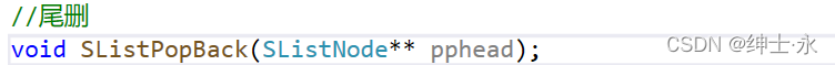 //尾删 void SListPopBack(SListNode** pphead) { //如果是空链表 if (*pphead == NULL) { return; } //如果只有一个结点 else if ((*pphead)->Next == NULL) { free(*pphead); *pphead = NULL; } //如果有多个结点 else { SListNode* prev = NULL;//前一个结点 SListNode* tail = *pphead;//尾结点 while (tail ->Next != NULL) { prev = tail; tail = tail->Next; } free(tail); tail = NULL; prev->Next = NULL; } }