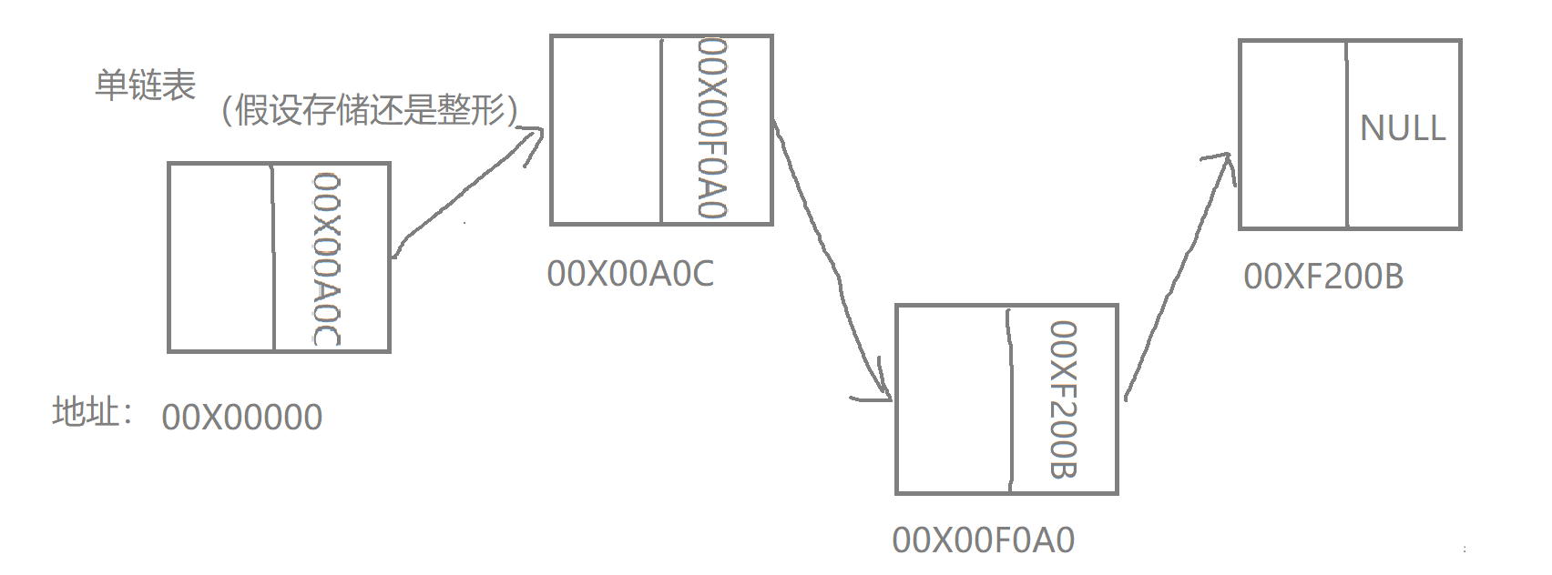 链表就是逻辑连续,物理不一定连续的线性表。如下图,逻辑上是利用指针将其串联起来的,物理上却是杂乱的,最后以NULL空指针结束。