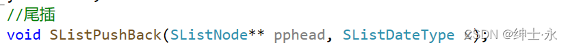 void SListPushBack(SListNode** pphead, SListDateType x) { //创建结点 SListNode* newnode = BuySListNode(x); //第一种情况 if (*pphead == NULL) { *pphead = newnode; } //第二种情况 else { SListNode* tail = *pphead; while (tail->Next != NULL) { tail = tail->Next; } tail->Next = newnode; } }