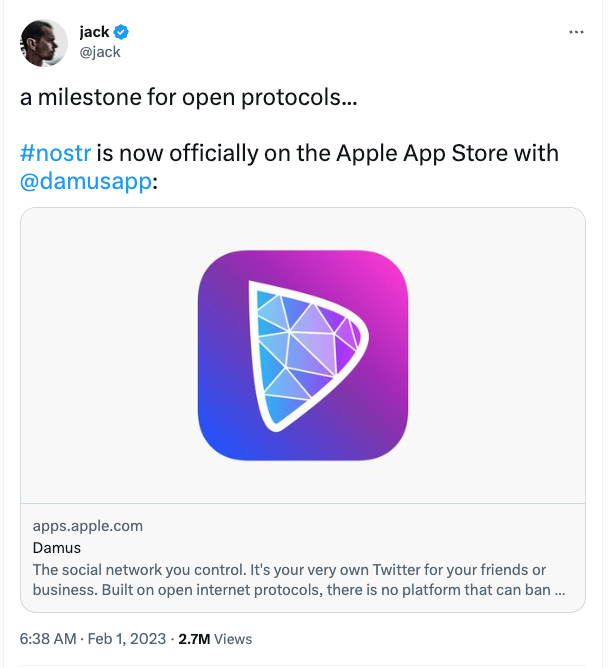 2 月 1 日,一款名为 Damus 的社交网络应用上架 App Store;在一天就冲到了 App Store 社交媒体类别下载榜单的第十位。
