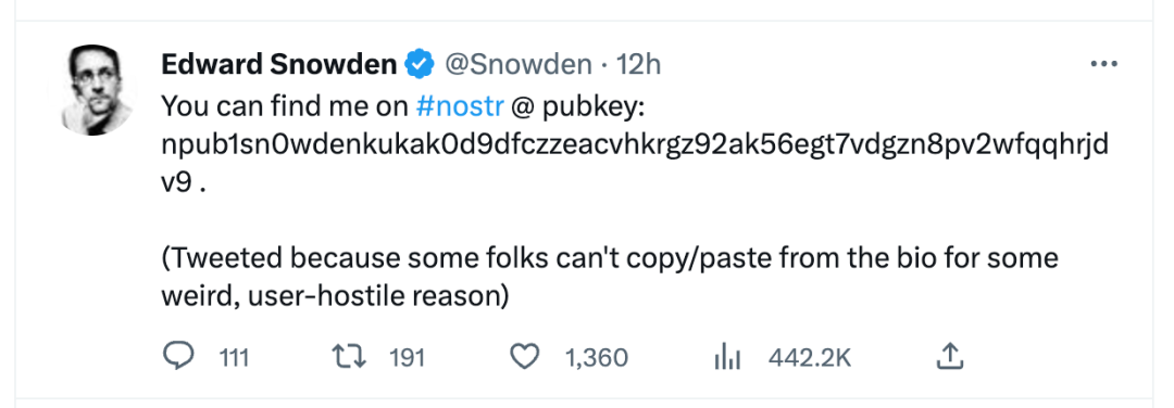 甚至连当年棱镜门事件主角、揭露美国 CIA 全球监听计划的爱德华-斯诺登也在第一时间注册了 Nostr 账号,并在 Twitter 上公开了自己的 Pubkey。