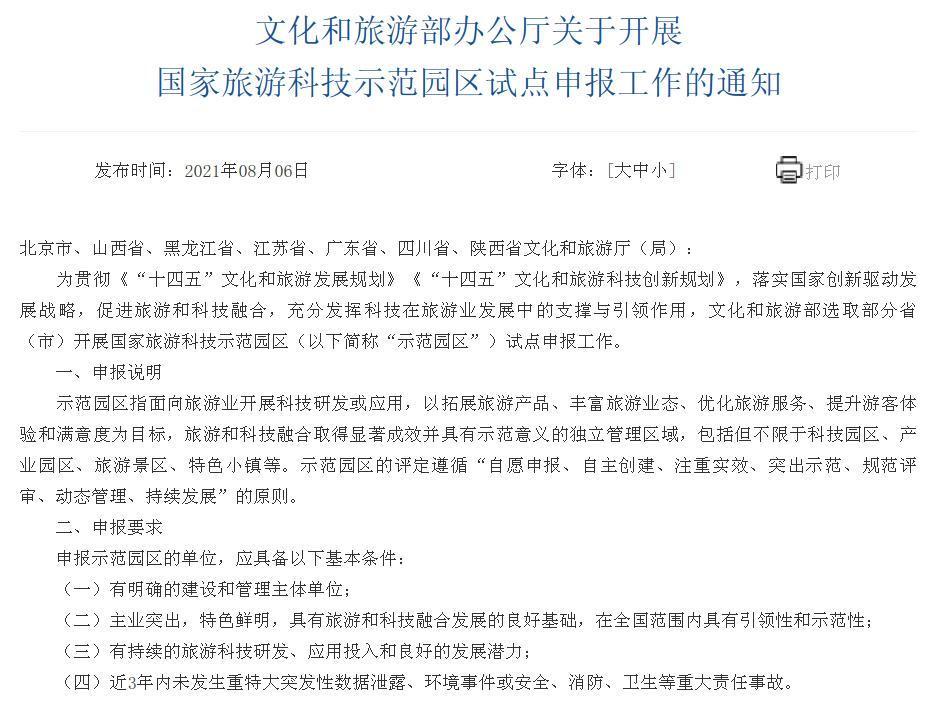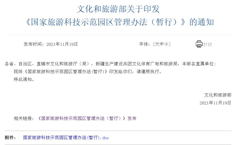 - 4.2021/11/19文旅部官网:《文化和旅游部关于印发《国家旅游科技示范园区管理办法(暂行)》的通知》