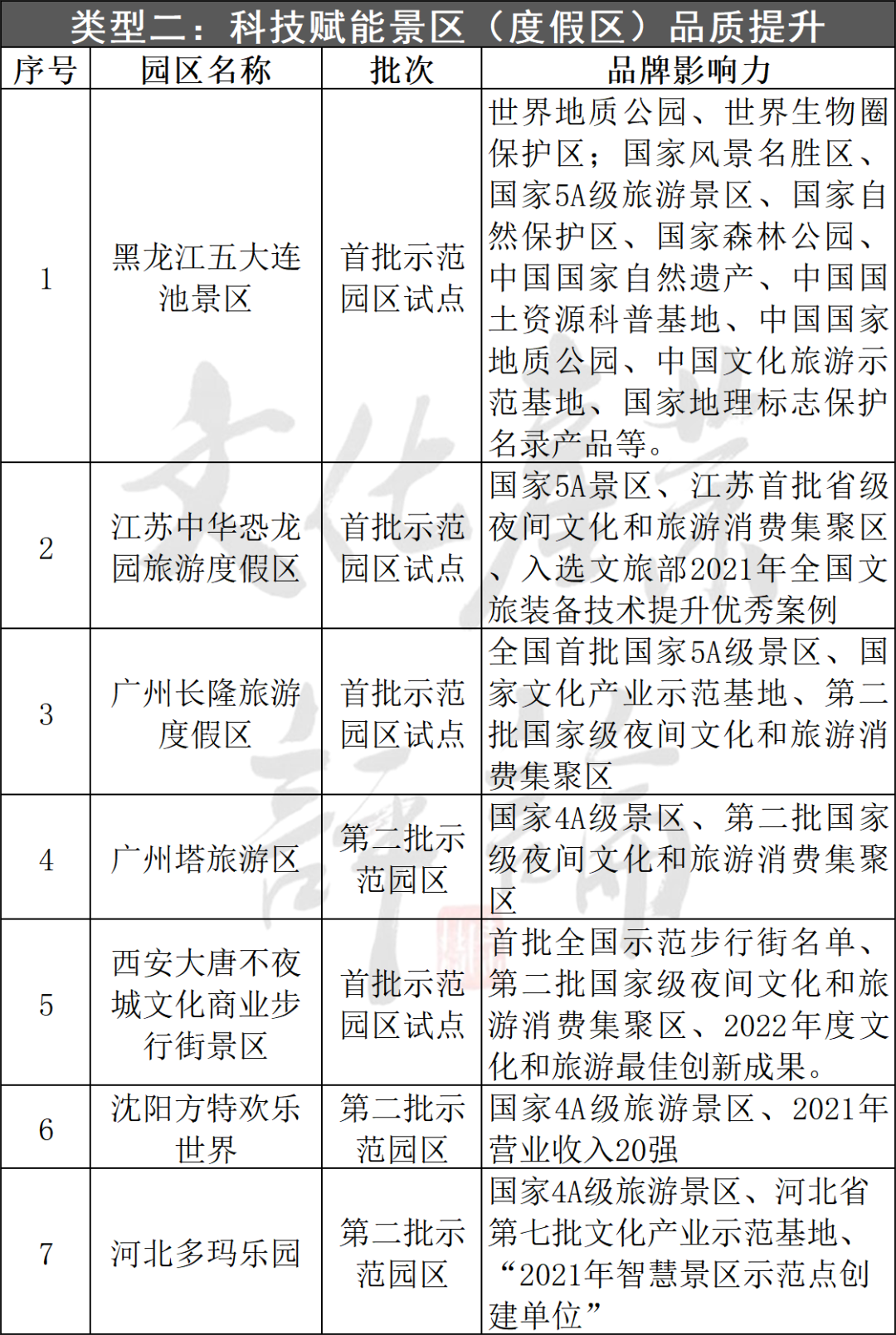 纵观二批次19家旅游科技示范园区,其中旅游景区、度假区、传统街区与科技融合的示范案例多达7个,分别是黑龙江五大连池景区、江苏中华恐龙园旅游度假区、广州长隆旅游度假区、广州塔旅游区、西安大唐不夜城文化商业步行街景区、沈阳方特欢乐世界和河北多玛乐园。其中,5A级和4A级景区各3家,均是通过数字科技手段实现一景多看、老景新看、古景今看的典型案例。