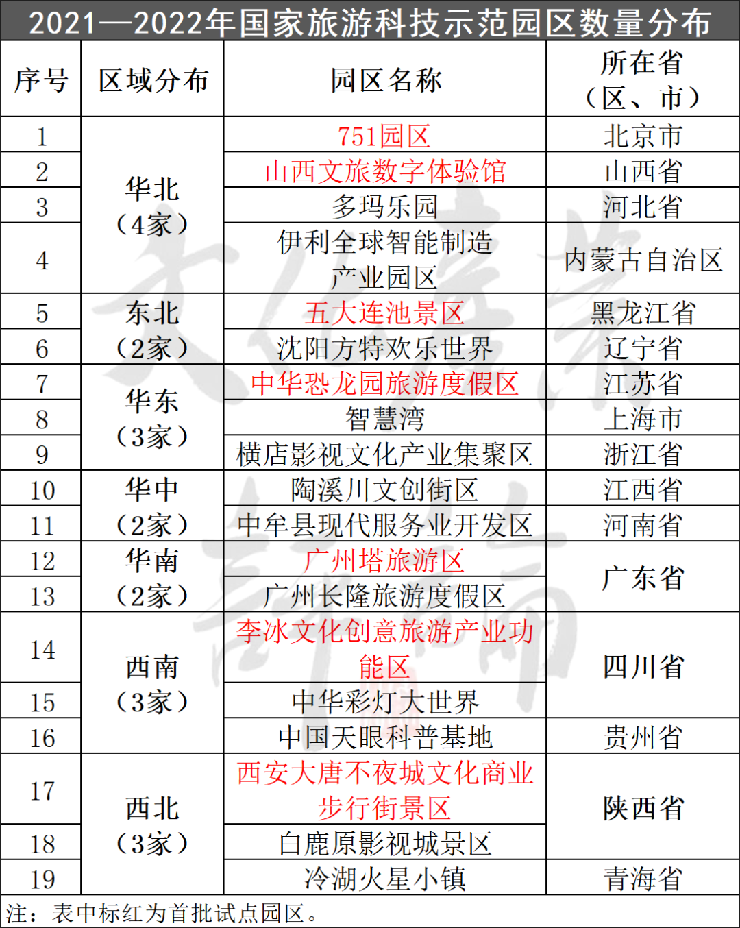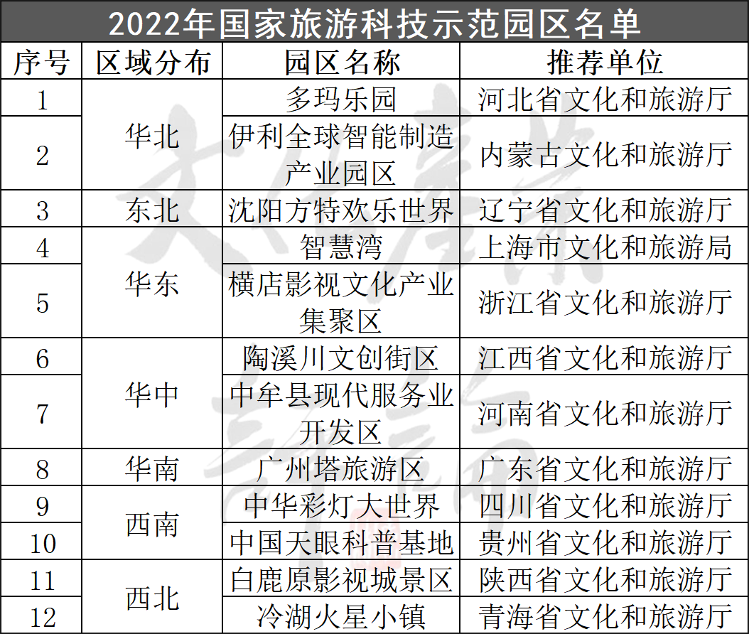 近日,文旅部发布了《关于公布2022年国家旅游科技示范园区名单的公示》。河北多玛乐园、沈阳方特欢乐世界、广州塔旅游区、青海冷湖火星小镇等12家单位被认定为第二批国家旅游科技示范园区。至此,加上去年11月文旅部确定的首批7家试点园区,国家级旅游科技示范园区增至19家。