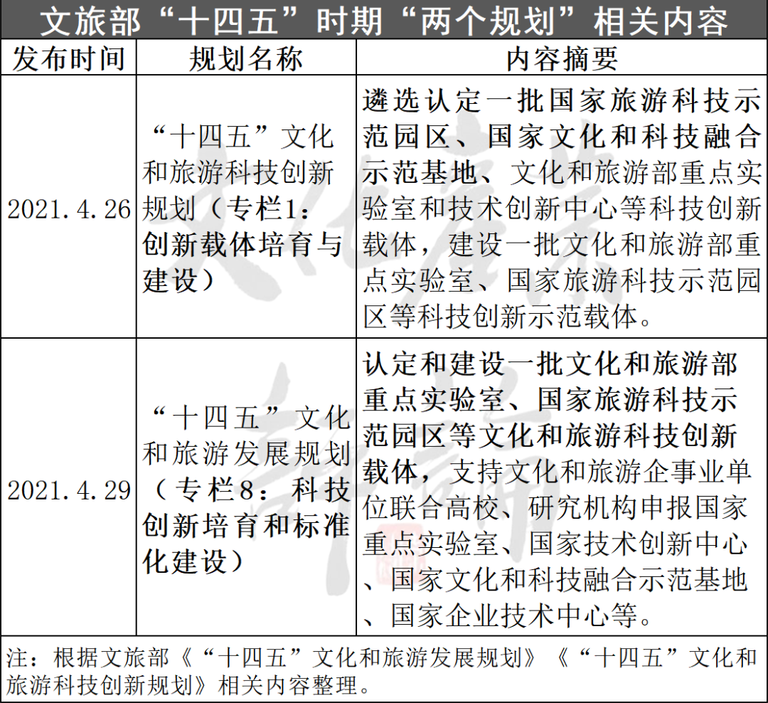 2021年4月,文旅部先后制定印发《“十四五”文化和旅游发展规划》《“十四五”文化和旅游科技创新规划》。“两个规划”分别就深入实施科技创新驱动战略,全面提升文化和旅游科技创新能力作出系统部署,并明确提出,认定和建设一批文化和旅游部重点实验室和技术创新中心、国家旅游科技示范园区。