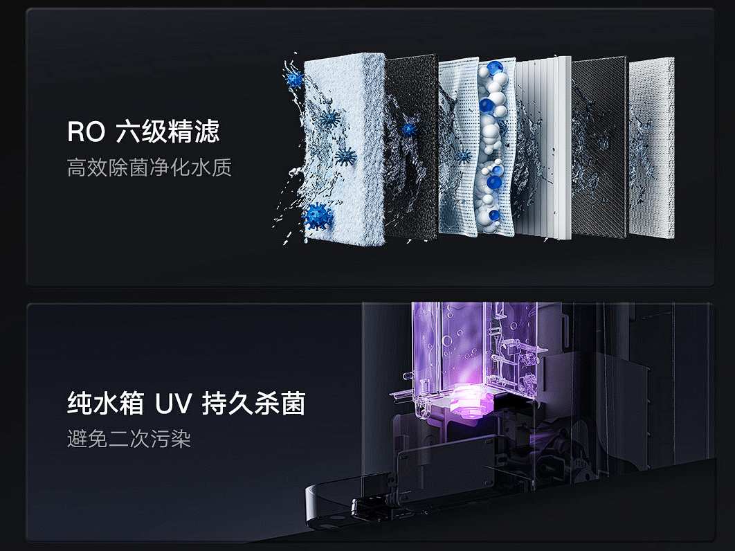 近日,小米商城上架了一款米家台式净饮机(智享版),我们就借着这款产品来简单了解一下净饮机。据官方介绍,该产品采用RO反渗透滤芯+PPC复合滤芯,双芯6级深度过滤,能滤除自来水中的细菌、病毒、重金属、农残等有害物质。纯水存储箱还加入UV灯持续杀菌,对大肠杆菌的灭杀率高达99.9%。原水箱和废水箱完全分隔,确保每次出水都是洁净、卫生。