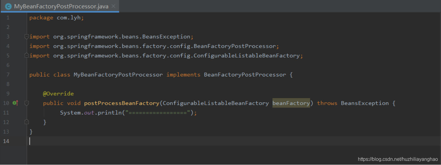 1 先自定义一个MyBeanFactoryPostProcessor类,实现BeanFactoryPostProcessor接口