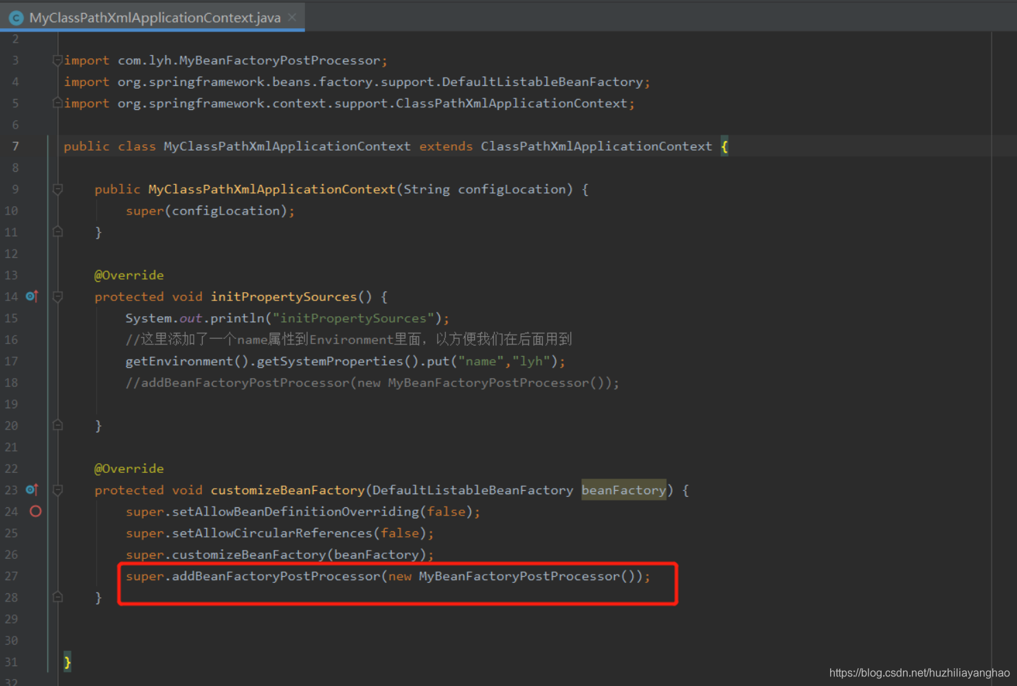 2 在自己的MyClassPathXmlApplicationContext类中,customizeBeanFactory方法中添加:super.addBeanFactoryPostProcessor(new MyBeanFactoryPostProcessor());