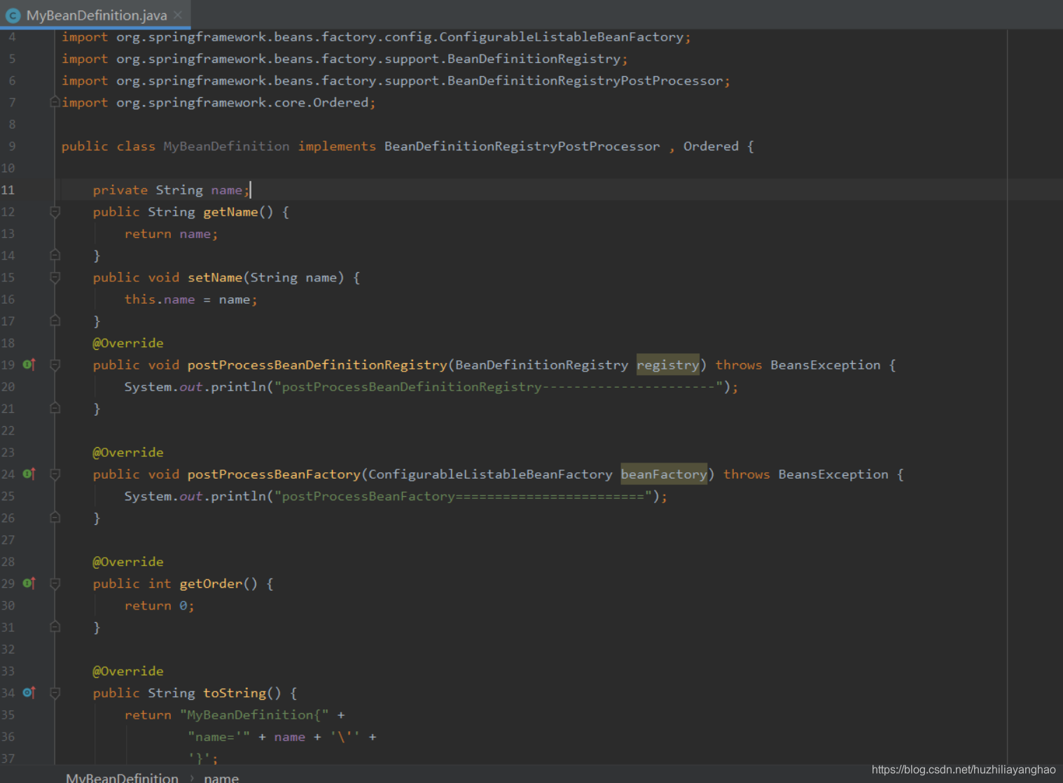 4 定义一个MyBeanDefinition类,实现接口BeanDefinitionRegistryPostProcessor,Ordered