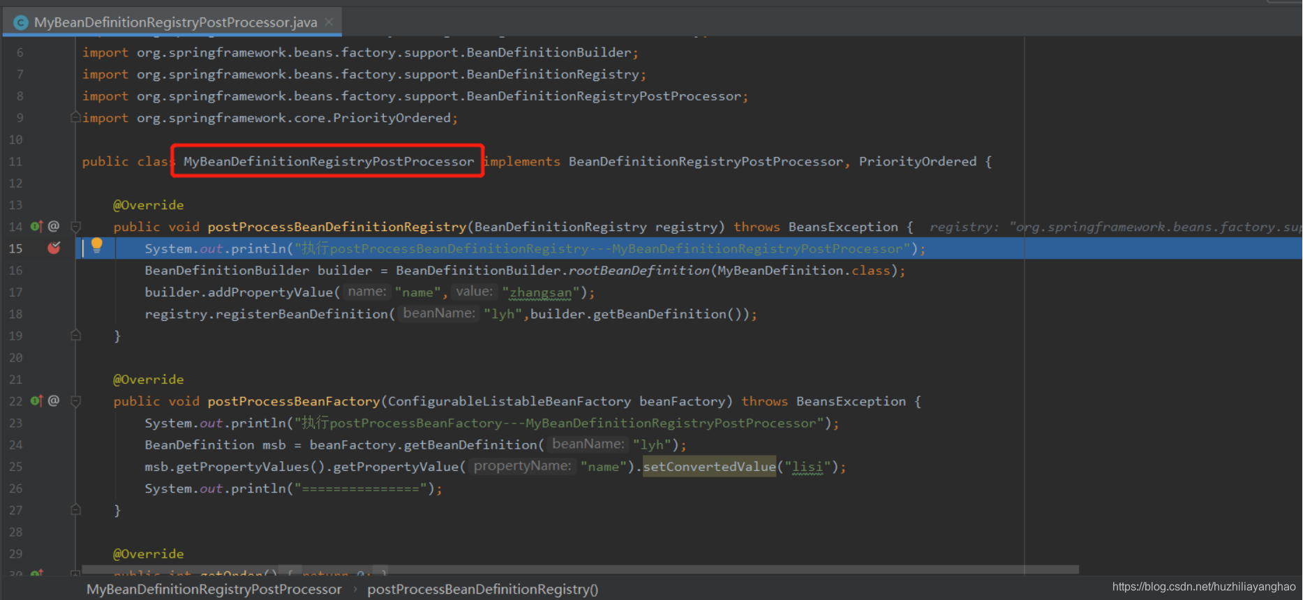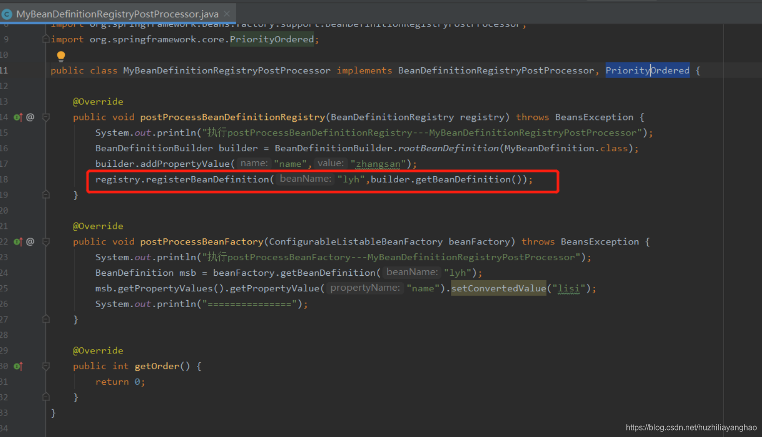 5 再定义一个类MyBeanDefinitionRegistryPostProcessor,实现接口BeanDefinitionRegistryPostProcessor,PriorityOrdered