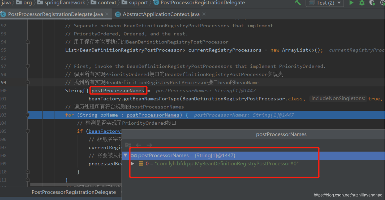 继续执行,又获取到了新增加的BeanDefinitionRegistryPostProcessor类:MyBeanDefinition