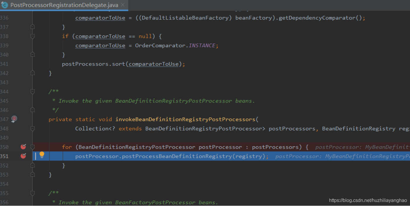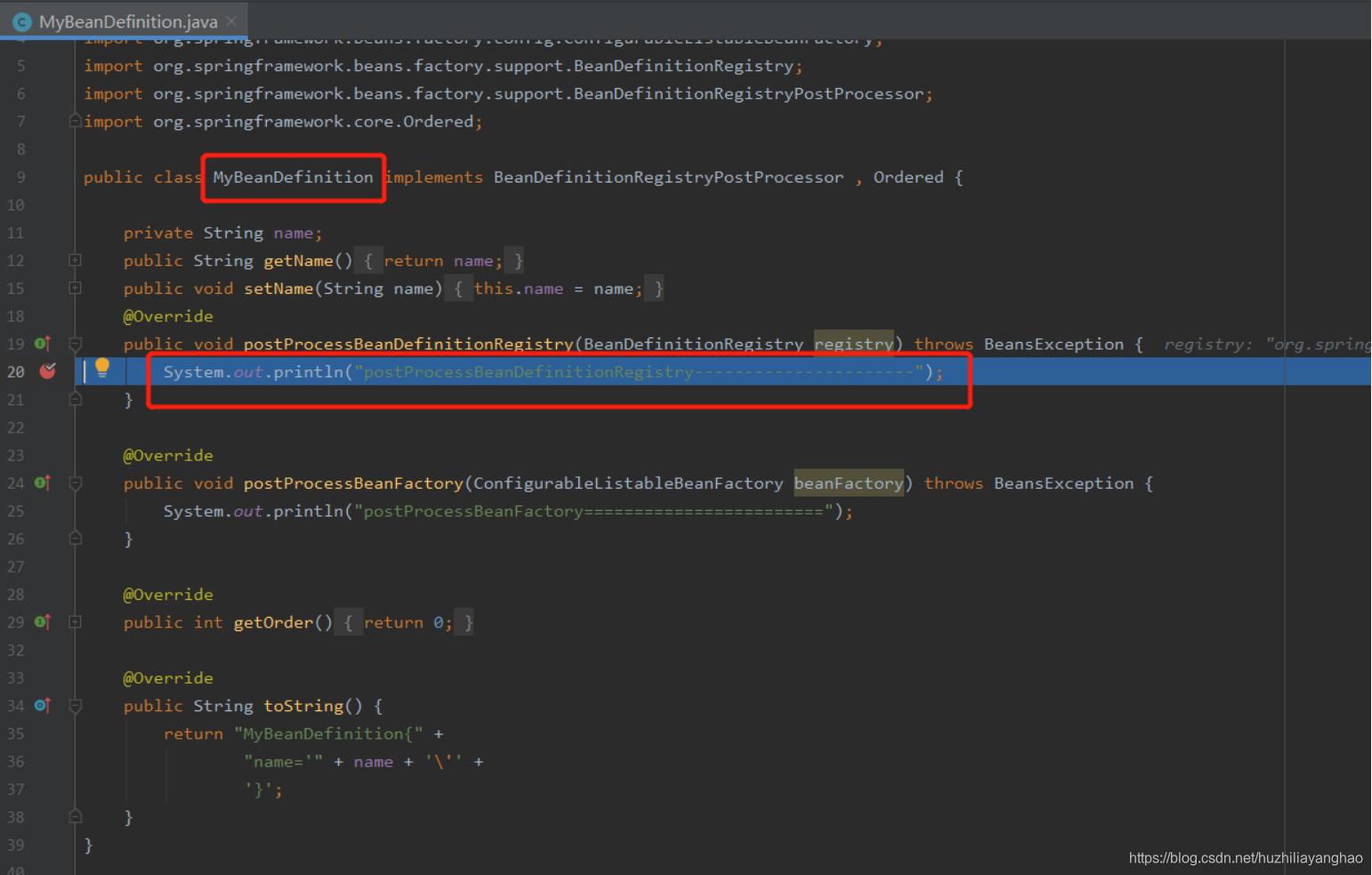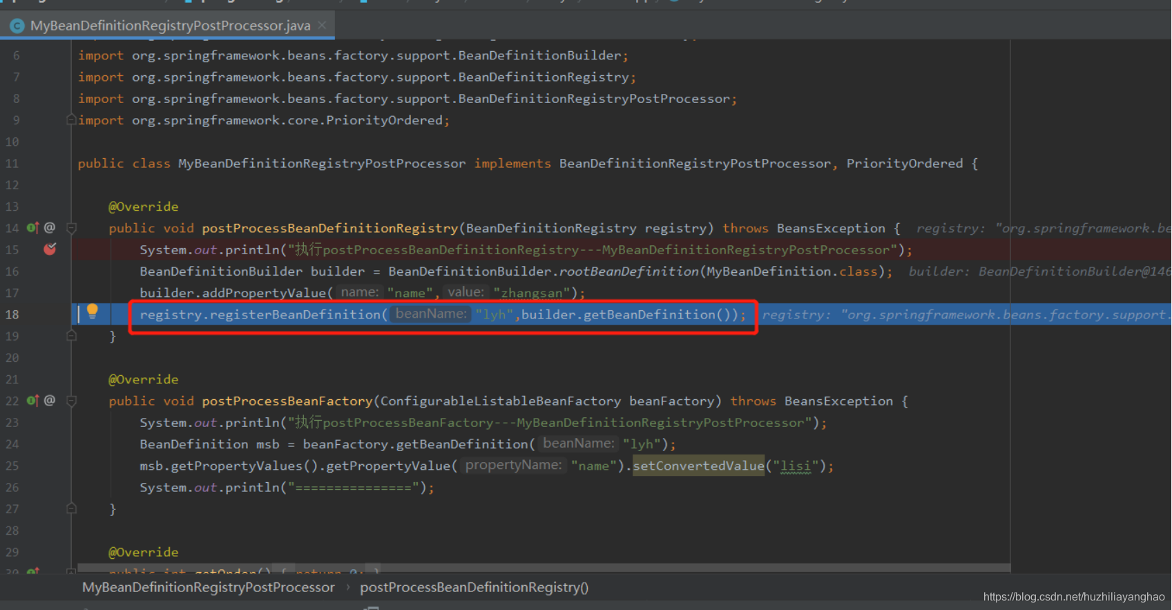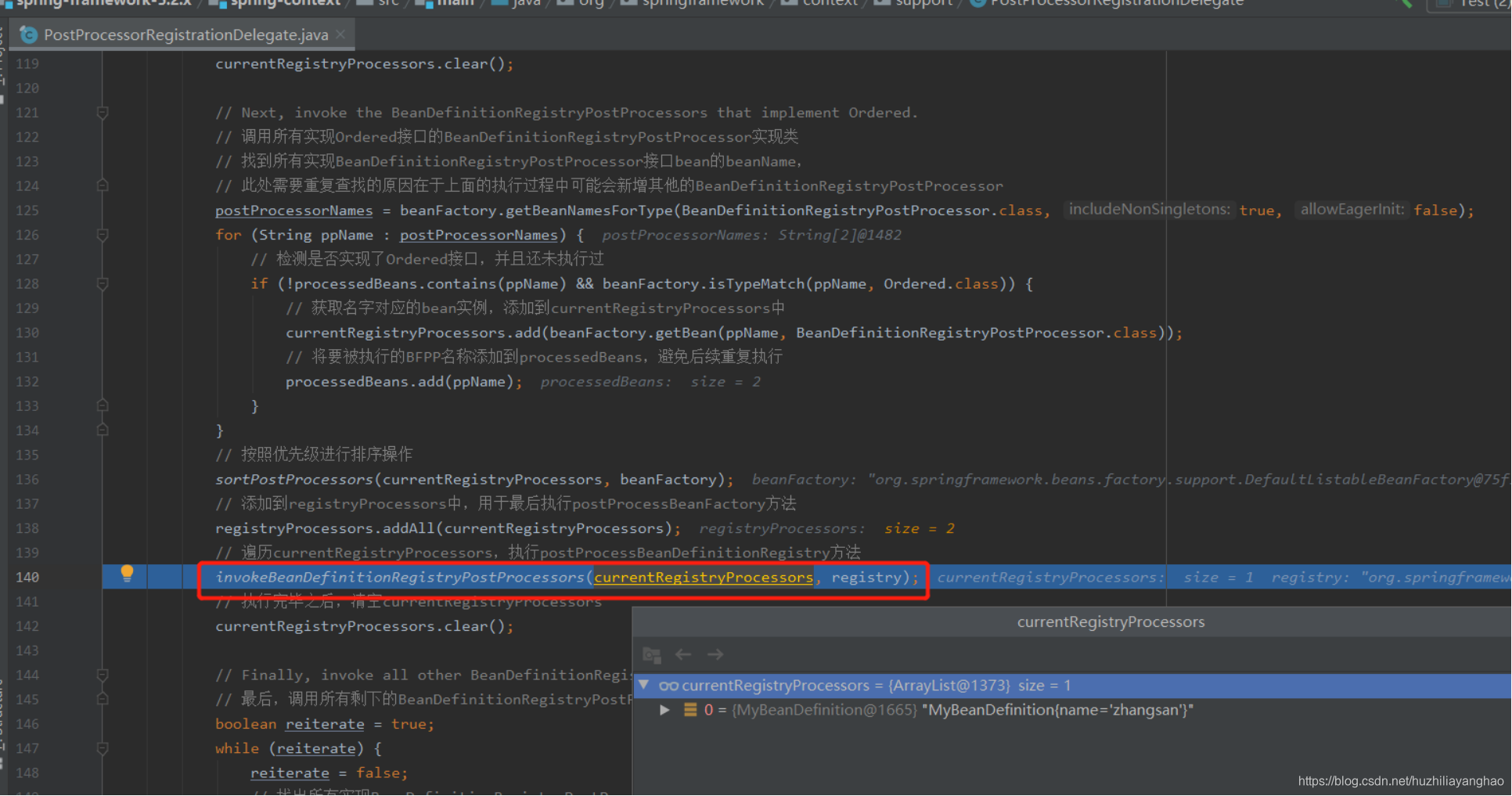 继续执行新增加的BeanDefinitionRegistryPostProcessor类:MyBeanDefinition