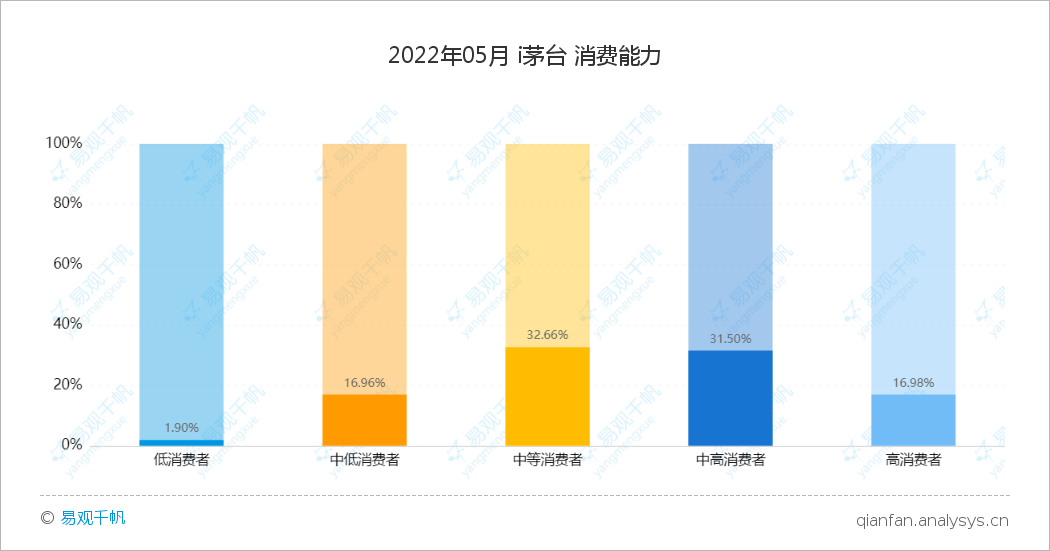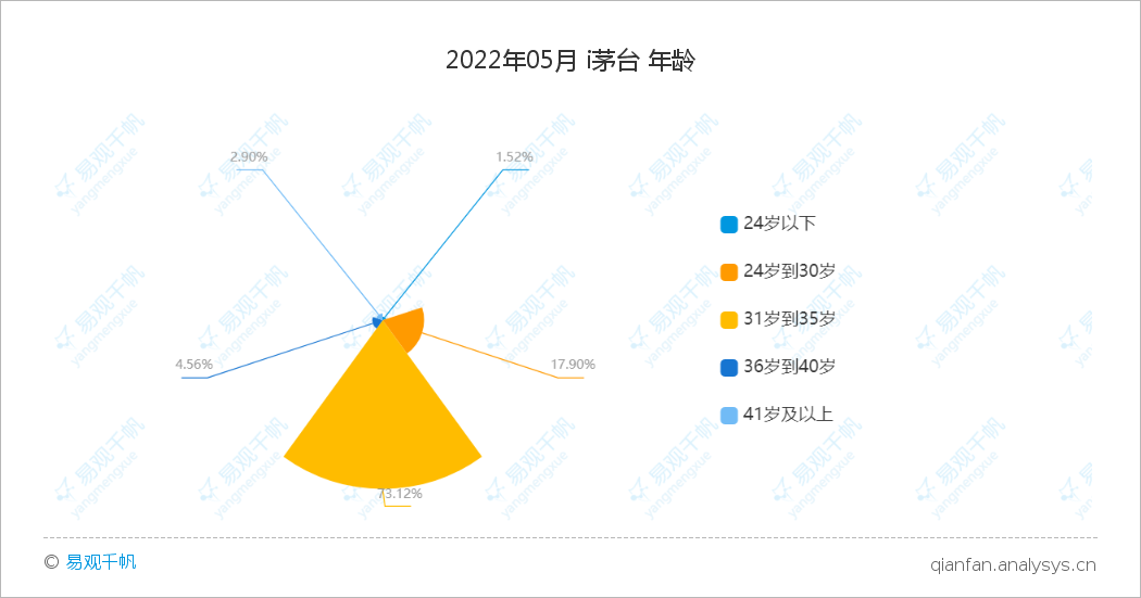 3月底“i茅台”APP上线之初,易观分析就曾对其用户数据进行过分析洞察。彼时易观千帆数据显示,其男性用户占比超过8成,41岁用户占比将近一半(49%),31~35岁用户占比超过4成(42%),拥有中高消费能力的中青年男性占据了“i茅台”APP的绝对主力。