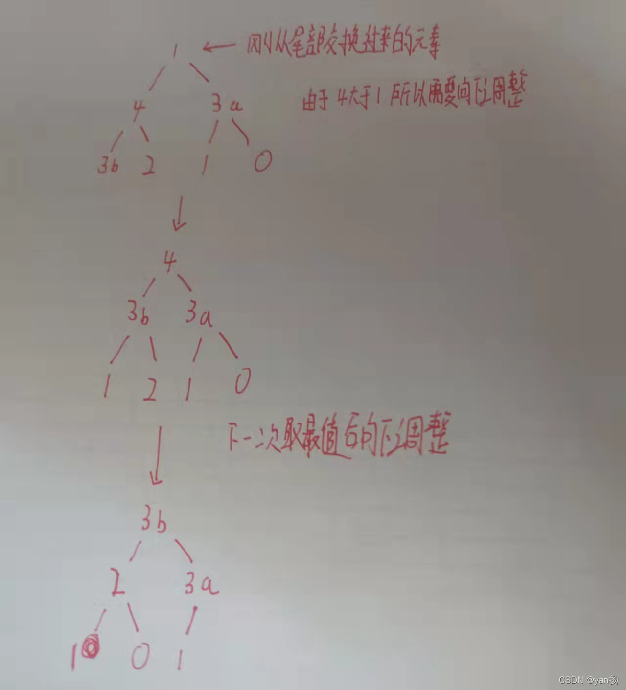 由于堆排序有向下调整的过程存在交换,所以后面的3b反而到了堆顶,因此堆排序不具有稳定性